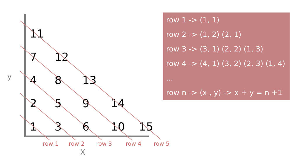 In my opinion, you can approach this challenge from multiple sides. The key, as always, is to divide the problem into smaller problems. So in my case, first I create a rule to get the row index in the triangle by summing both coordinates: - line 1 -> (1, 1) -> (1+1) - 1 row - line 2 -> (1, 2), (2, 1) -> (1+2) - 1 row
