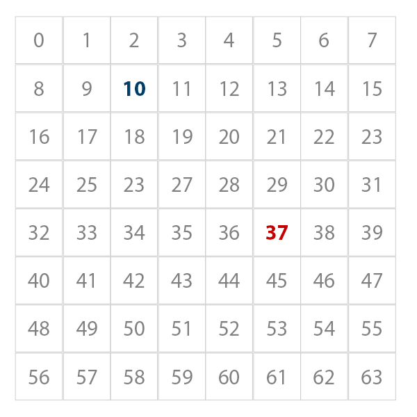 To help yourself get to and from your bunk every day, write a function called solution(src, dest) which takes in two parameters: the source square, on which you start, and the destination square, which is where you need to land to solve the puzzle. The function should return an integer representing the smallest number of moves it will take for you to travel from the source square to the destination square using a chess knight's moves (that is, two squares in any direction immediately followed by one square perpendicular to that direction, or vice versa, in an "L" shape). Both the source and destination squares will be an integer between 0 and 63, inclusive, and are numbered like the example chessboard below: