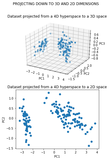 fig.suptitle('PROJECTING DOWN TO 3D AND 2D DIMENSIONS')