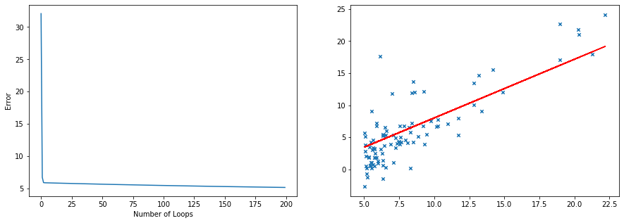 #Number of iterations cycles = 200 alpha = 0.01 #Gradient descent cost_h = [] for i in range(cycles): costf = costfunc(vector_x, vector_y, theta, m) cost = costf[0] cost_h.append(cost) error = costf[1] theta_0 = theta[0] - alpha*(1/m)*np.sum(error) theta_1 = theta[1] - alpha*(1/m)*np.sum(error*vector_x[:, 1]) theta = np.array([theta_0, theta_1]) y_sol = [theta[0] + theta[1]*x for x in data.x] #Plot cost function print('Cost Function graph with Alpha = {} doing {} loops'.format(alpha, cycles)) f, axs = plt.subplots(1,2,figsize=(15,5)) plt.subplot(1, 2, 1) plt.plot(list(range(cycles)), cost_h) plt.xlabel('Number of Loops') plt.ylabel('Error') #Plot Line plt.subplot(1, 2, 2) plt.plot(data.x, y_sol, color = 'red') plt.scatter(data.x, data.y,marker='x', s=20) plt.show() print() print('The final error is {}'.format(cost)) print() print('THE FINAL THETA IS {}'.format(theta))Cost Function graph with Alpha = 0.01 doing 200 loopsThe final error is 5.1786804785845755 THE FINAL THETA IS [-1.12450181 0.9146286 ]