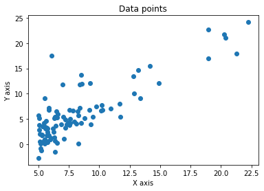 import pandas as pd import numpy as np import seaborn as sns import matplotlib.pyplot as plt pd.options.display.max_columns = 500 pd.options.display.max_rows = 500 # ============================================================================= #Load data data = pd.read_csv(r'_data/ex1data1.txt', header=None, names=['x', 'y']) #Plot data plt.plot(data.x, data.y, 'o') plt.title('Data points') plt.xlabel('X axis') plt.ylabel('Y axis') plt.show() #variables calculation m = len(data.x) theta = np.array([0, 0]) vector_x = np.array([[1]*len(data.x), data.x]).transpose() vector_y = np.array(data.y) -