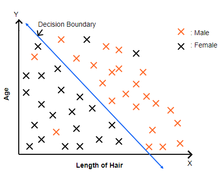 This image shows how logistic regression divides data into two groups (Male and Female) using a decision boundary — the blue line.