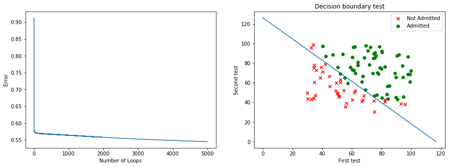 #Original hypothesis eq = lambda x, y: sigmoid(theta[0] + x*theta[1] + y*theta[2]) #Select a point by index to know the y index = 4 y = eq(vector_x[index, 1], vector_x[index, 2]) #Outputs print('hypothesis theta = {}, {}, {}'.format(theta[0], theta[1], theta[2])) print() print('With this hypothesis the point P(x1, x2) = ({}, {}) would have a y = {}'.format(vector_x[index, 1], vector_x[index, 2], y))hypothesis theta = [-9.78506335], [0.08377175], [0.0775022] With this hypothesis the point P(x1, x2) = (79.0327360507101, 75.3443764369103) would have a y = [0.93553537]#Resolving equation for two points theta.flatten() x_pts = [] y_pts = [] ##If x2 = 0 y_pts.append(0) x1 = -theta[0]/theta[1] x_pts.append(x1) ##If x1 = 0 x_pts.append(0) y2 = -theta[0]/theta[2] y_pts.append(y2) #Plot cost function print('Cost Function graph with Alpha = {} doing {} loops'.format(alpha, cycles)) f, axs = plt.subplots(1,2,figsize=(15,5)) plt.subplot(1, 2, 1) plt.plot(list(range(cycles)), cost_h) plt.xlabel('Number of Loops') plt.ylabel('Error') #Plot Line plt.subplot(1, 2, 2) plt.scatter(datay0.x, datay0.x1, marker = 'x', color='red', label ='Not Admitted') plt.scatter(datay1.x, datay1.x1, marker = 'o', color='green', label='Admitted') plt.plot(x_pts, y_pts) plt.title('Decision boundary test') plt.xlabel('First test') plt.ylabel('Second test') plt.legend() plt.show()Cost Function graph with Alpha = 0.001068 doing 5000 loops