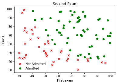 import pandas as pd import numpy as np import seaborn as sns import matplotlib.pyplot as plt pd.options.display.max_columns = 500 pd.options.display.max_rows = 500 # ============================================================================= # =========================== INSERT YOUR CODE BELOW =========================== # ============================================================================= #Load data data = pd.read_csv(r'_data\ex2data1.txt', header=None, names=['x', 'x1', 'y']) datay0 = data.where(data.y == 0).dropna() datay1 = data.where(data.y == 1).dropna() #Printed data print(data.head()) #Plot data plt.scatter(datay0.x, datay0.x1, marker = 'x', color='red', label ='Not Admitted') plt.scatter(datay1.x, datay1.x1, marker = 'o', color='green', label='Admitted') plt.title('Second Exam') plt.xlabel('First exam') plt.ylabel('Y axis') plt.legend() plt.show()x x1 y 0 34.623660 78.024693 0 1 30.286711 43.894998 0 2 35.847409 72.902198 0 3 60.182599 86.308552 1 4 79.032736 75.344376 1 -