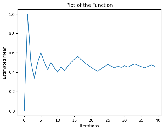 The y-axis represents the estimated probability and the x-axis represents the number of iterations. As the number of iterations increases, the estimated mean converges to the actual probability of the machine to gain a reward.