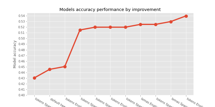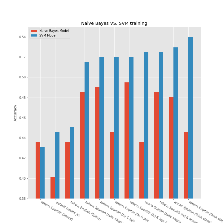 labels = ['tokens Spanish (Spacy)', 'default tweets_es', 'tokens English (Spacy)','tokens Spanish (false stops)' ,'tokens Spanish (fs) & jaja', 'tokens English (fs) & jaja', 'tokens Spanish (fs) & jaja & hashtag', 'lemas English (false stops)', 'tokens Spanish (fs) & emojis', 'lemas Spanish (false stops)', 'tokens English (false stops)']