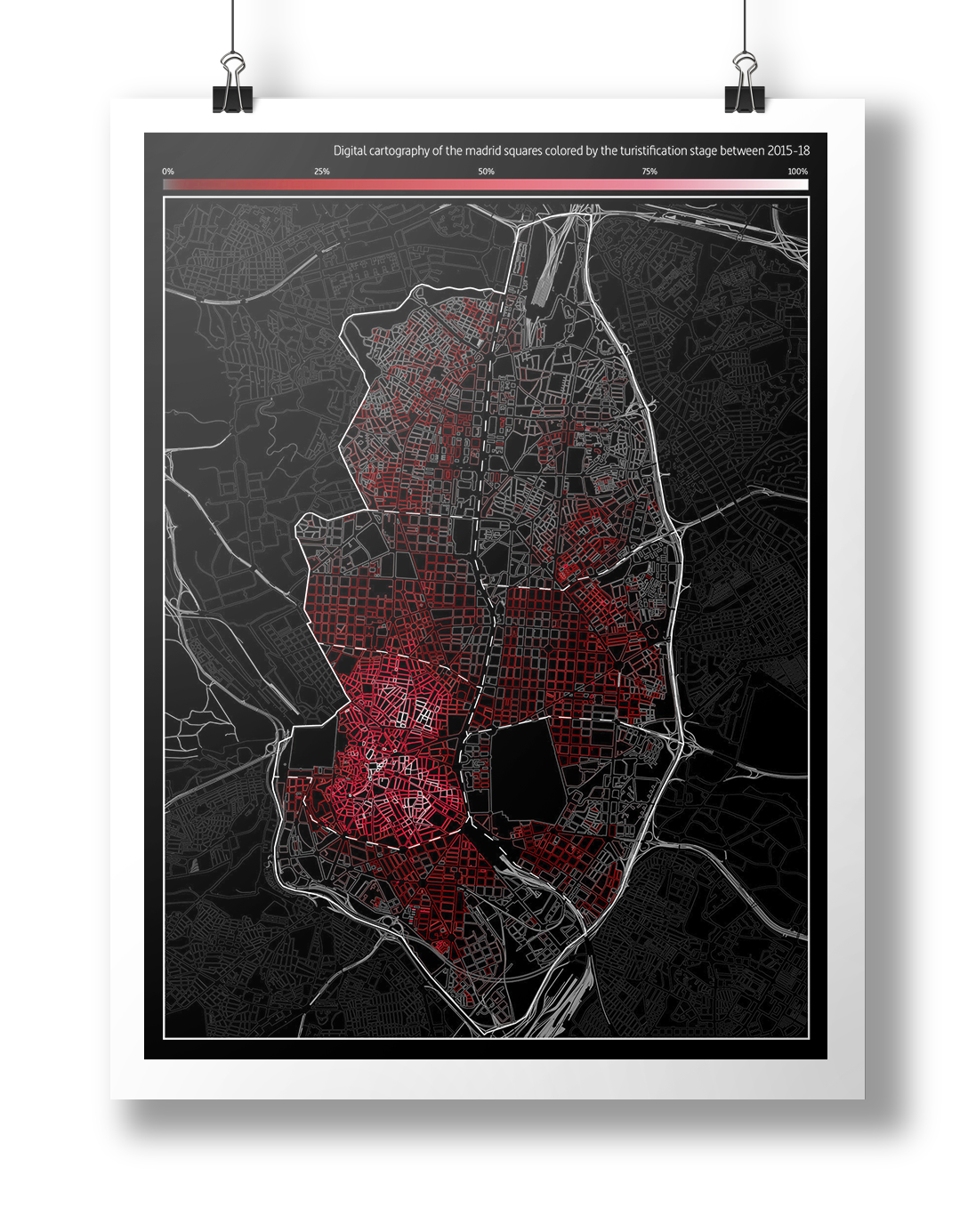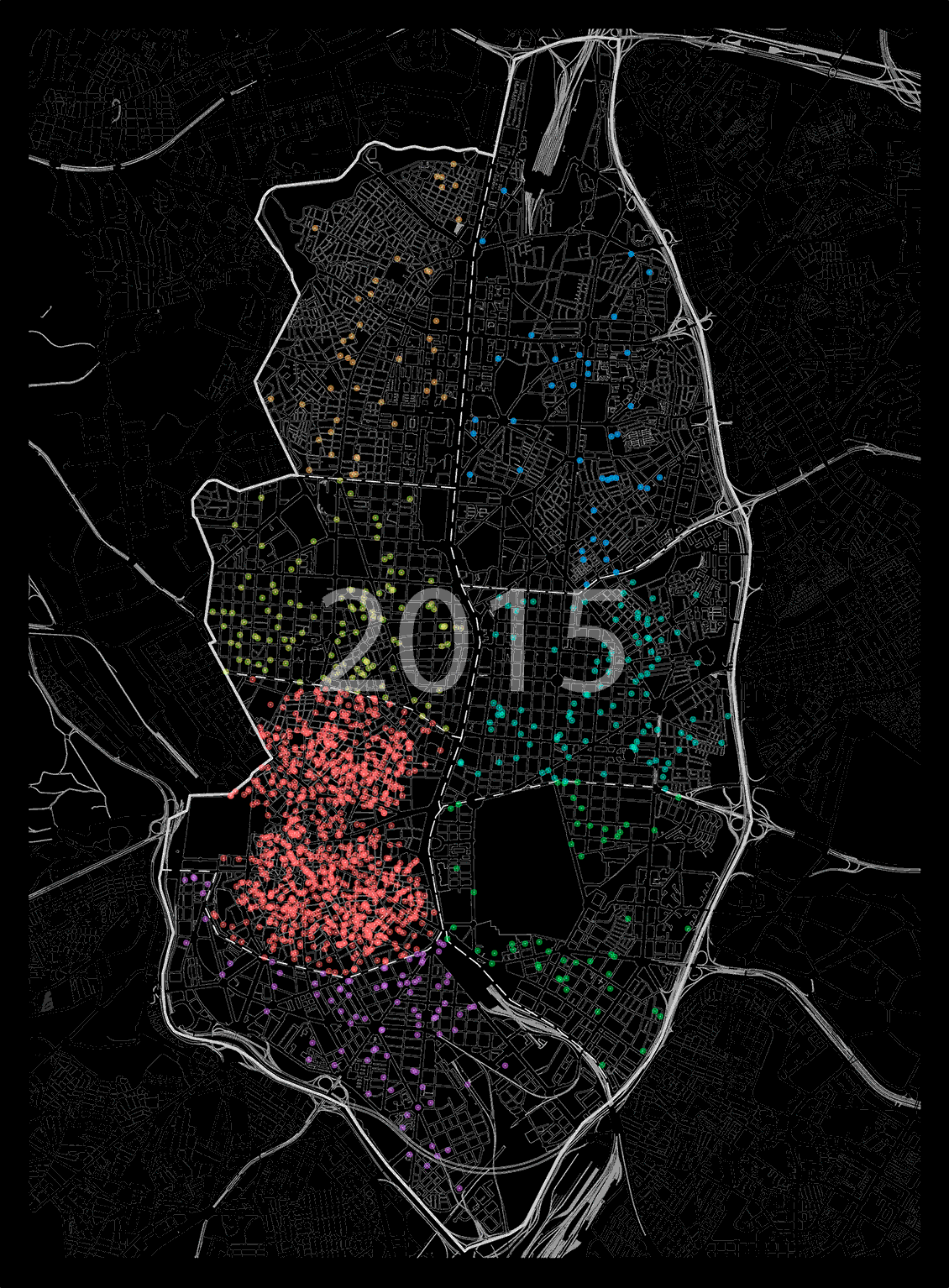 - Digital cartography showing a gradient map, filtering the affection of each square by the number of Airbnb apartments and the area of the square.
