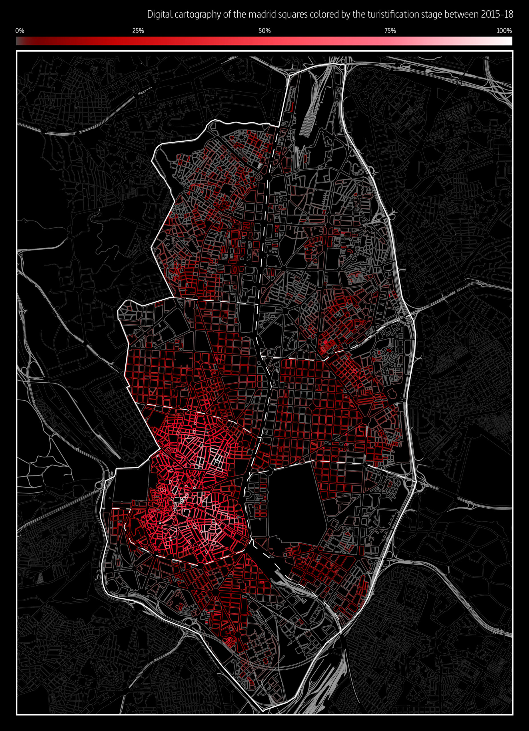 - Digital cartography with a lower scale showing the tourist rent affection in the Madrid Central district from 2015 to 2018.