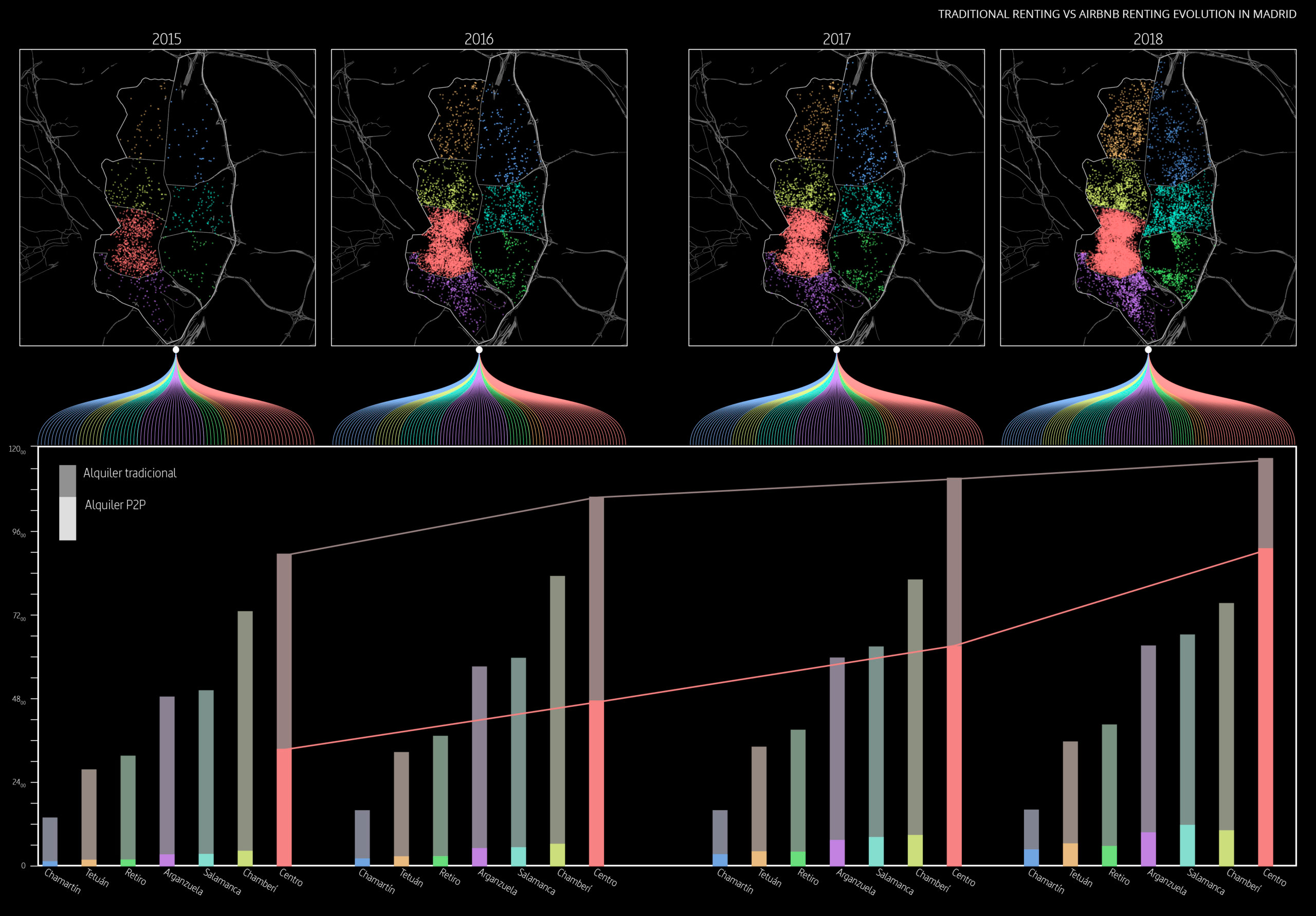 - Digital cartography locating all Airbnb data as points colored by the district. One cartography per year.