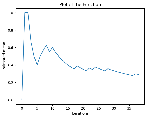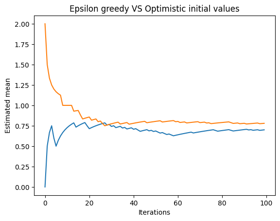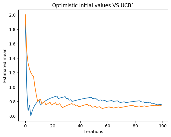 In the next plot, we can see two lines. The blue line represents the estimated mean obtained using the optimistic initial values method, and the orange line represents the estimated mean obtained using the UCB1 method. The plot helps us visualize the convergence of the estimated means towards the actual probability of gaining a reward for each bandit machine.