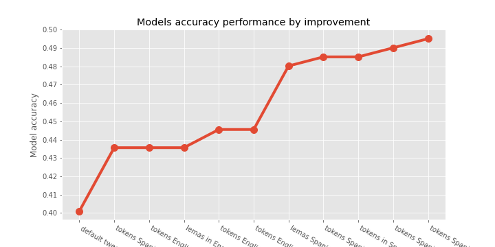 labels = ['tokens Spanish (Spacy)', 'default tweets_es', 'tokens English (Spacy)','tokens Spanish (false stops)' ,'tokens Spanish (fs) & jaja', 'tokens English (fs) & jaja', 'tokens Spanish (fs) & jaja & hashtag', 'lemas English (false stops)', 'tokens Spanish (fs) & emojis', 'lemas Spanish (false stops)', 'tokens English (false stops)']